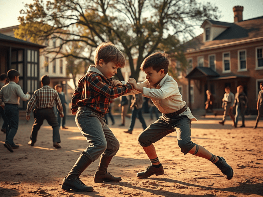 The post has an excerpt from an 1857 novel, Tom Brown’s School Days, by the English author Thomas Hughes. The story follows 11-year-old Tom Brown as he adjusts to the often-harsh life at a boarding school. The excerpt is the lead-in to a scene in which young Tom has to fight a schoolyard bully in defense of another student who had been placed in Tom’s charge by the headmaster. The excerpt does not go on to describe the fight; we’ll have to read the book to find out how Tom does, although I suspect he acquits himself well. But the authors of the manvotional post, AoM’s Brett and Kate McKay, highlight two passages from the excerpt: