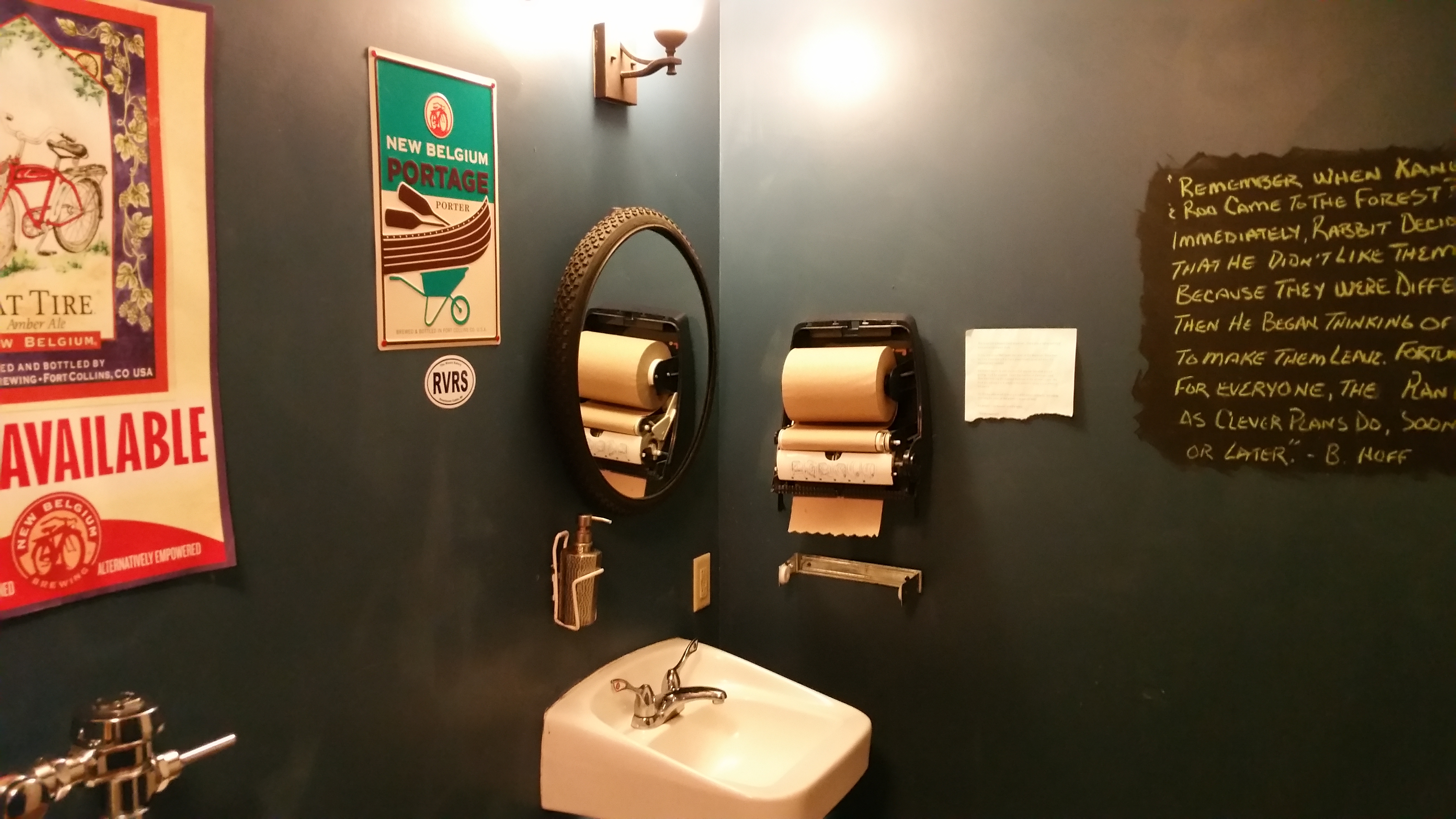 Even the bathrooms at Redbery are unique, including its “naked” towel dispenser. The note next to it says that since the cover came off, patrons have used about half as much paper as before.