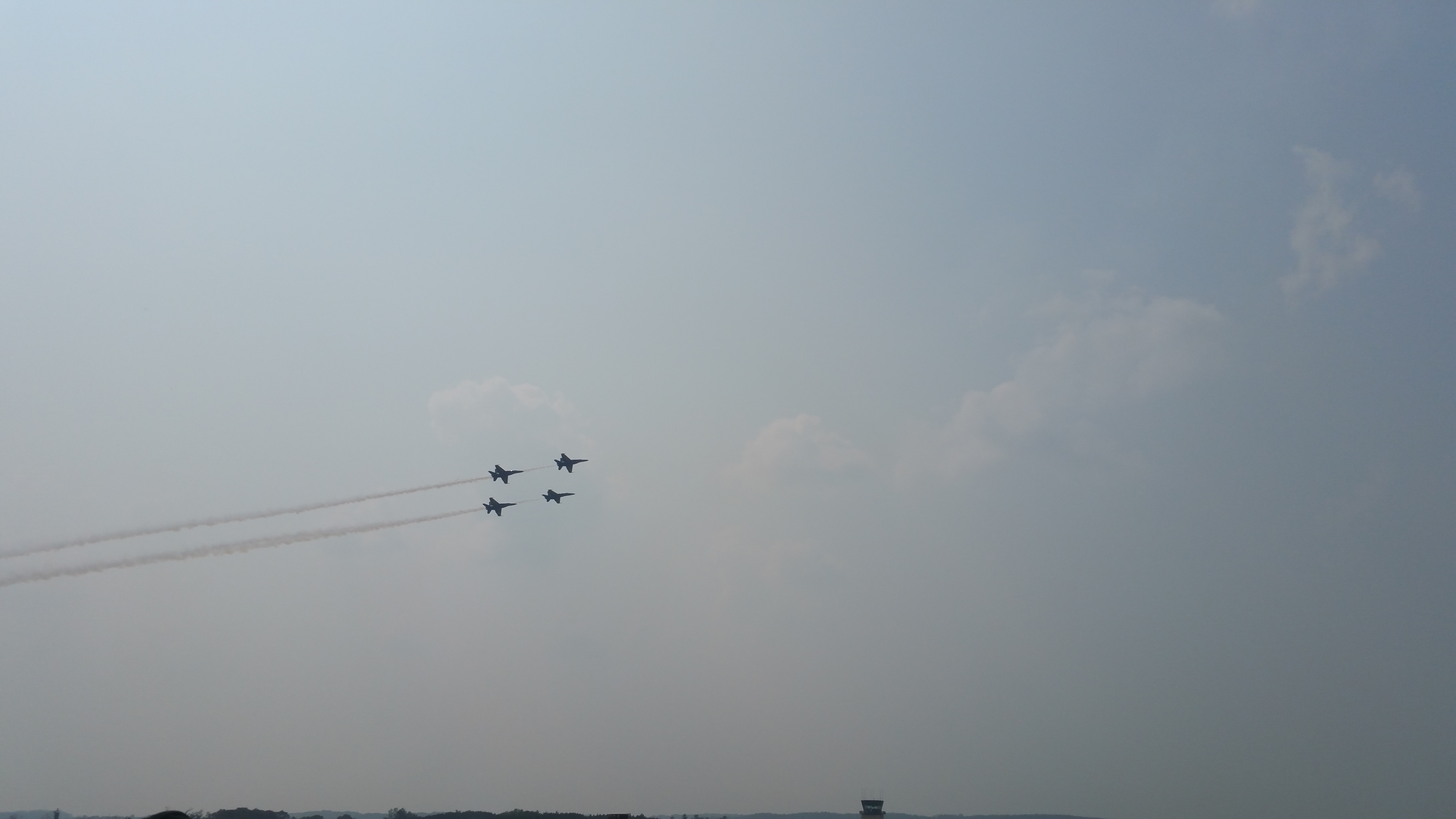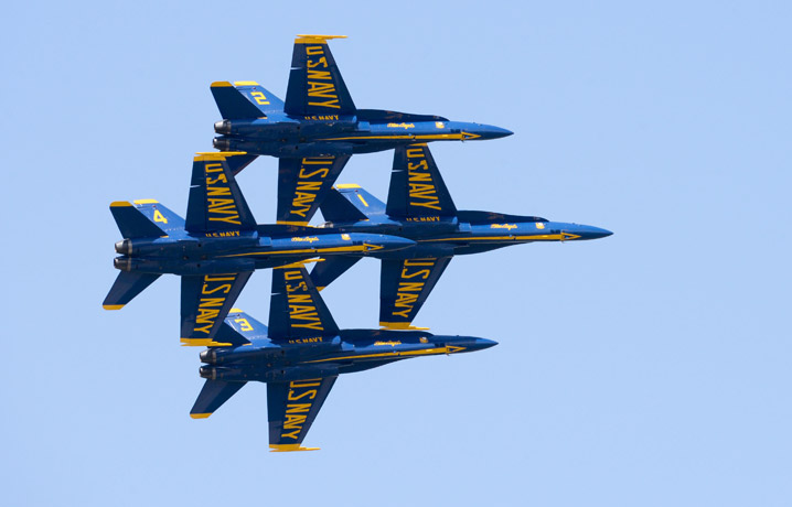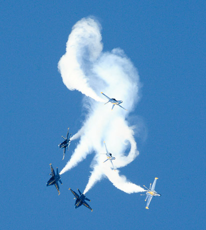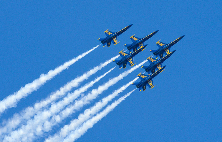 Today’s military pilots are generally older, but not by much. In the Blue Angels team, the flight leader, Navy Captain Tom Frosch from Michigan, is in his mid-forties, but the five other pilots in the squadron all list high school graduation years from 1998-2002, according to their official bios. Every one of them has undergone far more extensive training than the typical U.S. fighter or bomber pilot had in World War II. The Blue Angels fly the F/A-18 Hornet, manufactured by McDonnell Douglas. The Hornet has been in service since 1983 and is used by the U.S. Navy and Marine Corps as well as some foreign countries. It is a twin-engine supersonic multipurpose aircraft, capable of flying bombing missions, providing close-air support and air-to-air combat. With a top speed of Mach 1.8 (1,190 mph) and a range of up to 1,250 miles, the Hornet is a versatile and deadly aircraft indeed. It’s also popular in the movies: Will Smith, playing a Marine Corps pilot, flew a Hornet in the movie Independence Day and duked it out with alien fighters. The show is spectacular indeed. My first visit to a Blue Angels show was on an overcast day with occasional raindrops, but the Angels flew anyway and did their low-altitude show. This time, skies were clear and the squadron was able to air it out, so to speak. I was able to take a few shots with my own camera, but they don’t really do the show justice.