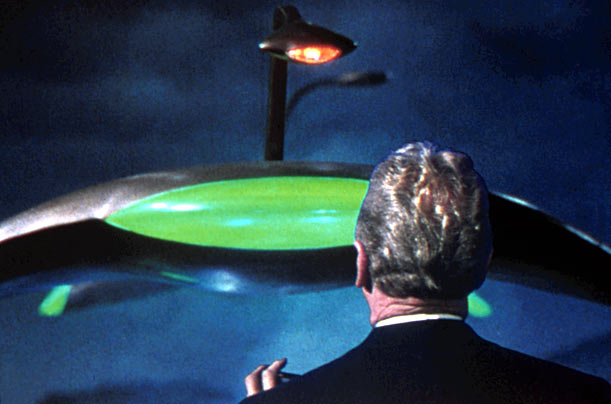 Many observers, both in 1953 and today, say The War of the Worlds was a metaphor for the actual Cold War that was then gripping the planet. There were a few movies and books about a Soviet invasion of America, to be sure, and as recently as the 1980s movies like Red Dawn gave us an America besieged by terrestrial adversaries. But in 1953, our country had fought and won a terribly costly world war just a few years earlier, and was at the time of the film’s release trying to extricate itself from the brutal Korean conflict. Domestic audiences were tired of fighting other nations, and though there would be many movies in the fifties that had WW2 or Korea-based themes, moviegoers were looking for something a little more “out there” for their entertainment, and what better way to get that than to have movies about beings from “out there”? The advent of color film and special effects made science fiction films more plausible and attractive. The 1953 film won an Academy Award for visual effects and was one of the many memorable movies produced by George Pal, a Hungarian-born animator who also gave us classics like Destination Moon, When Worlds Collide and Conquest of Space. Even today, Pal’s effects in The War of the Worlds hold up fairly well, and the sound effects associated with the Martian weapons would show up again on the soundtracks of other movies and TV series. On the original Star Trek series, which made its debut fifty years ago next month, the photon torpedo launchers aboard the starship Enterprise used the same sounds generated by the firing of the Martians’ wingtip disruptor beams from the ’53 movie. The sound effects were so good, in fact, that anybody who saw the movie even many years ago instantly recognizes them today. In this scene from the movie, the first exchange of fire between the Martians and the American defenders is touched off by the courageous pastor’s decision to confront them alone. It remains one of the most gripping scenes in a film that had more than a few of them: Pastor Confronts the Martians