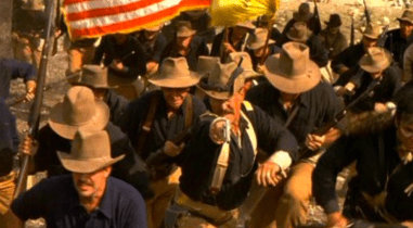 Would the United States have defeated Spain in 1898 without the Rough Riders? Undoubtedly yes. Spain’s navy was no match for ours, and without naval support to keep open their lines of reinforcement and supply, the Spanish troops on the islands could not last long against the invading Americans, who had access to almost limitless supplies and reinforcements, and had the backing of the indigenous guerillas besides. As to the reasons leading to our intervention, historians continue to debate the causes of the war to this day. Kicking the Spaniards out of Cuba would open a large, virtually untapped market to American goods, so there was certainly an economic incentive for the U.S., and American control of the island would also mean American control of its exports, an issue that is subtly addressed in the film, when Roosevelt is shown with a sugar company’s sign in the background. The desire for empire played a big part, too. Were these good reasons for going to war? To most Americans of the day, the answer was yes. Today, we have a tendency to view our ancestors’ actions through the lens of our own modern sensibilities and experiences. Whatever war you’re talking about, there are always going to be economic reasons behind the decision to send in the troops, and some will want war for reasons even more selfish than that. We should be careful about judging their decisions; after all, Americans in future centuries will doubtless look back on a lot of our decisions and question our motives, too.