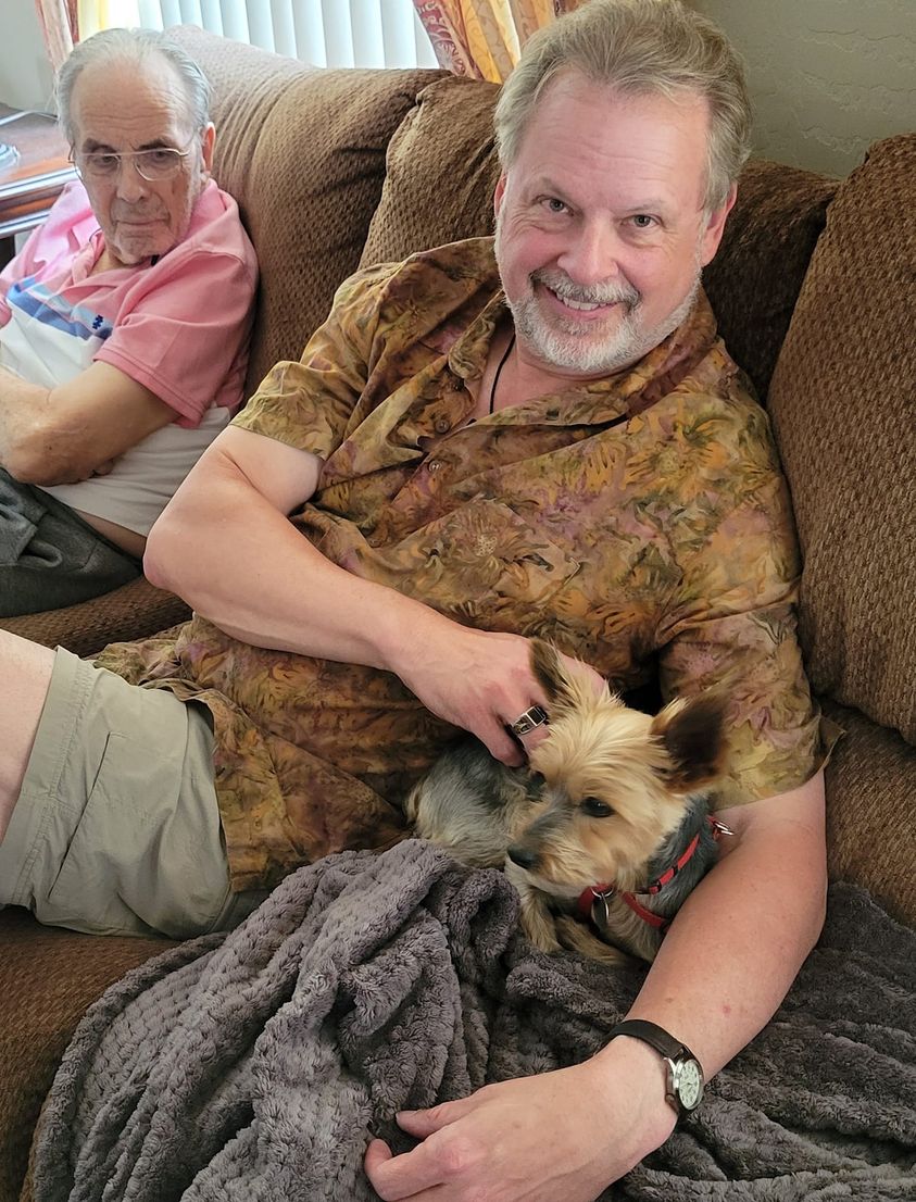 I took a week off from work, my first full week away from radio since August of 2019, and flew to Phoenix the other day to visit my family. My father turned 86 in February, my mother will be 85 in a couple weeks. They moved into an assisted living facility in Surprise back on October 1, and they’re doing pretty well. Various orthopedic and intestinal problems have rendered my strapping, athletic father rather weak and frail, and his mind isn’t as sharp as it used to be, but the time I spent with him was a blessing for both of us, especially for me. I was still locked in the vise-grip of grief over the passing of my dog, Sophie, a few weeks earlier. My dad, who has been a life-long dog lover and has had to deal with the loss of many, listened to me describe my pain and held me as I wept. My parents have a Yorkie named Bobbie, and she comforted me, too, just by letting me hold her. One day during my visit, we all went to my brother Brian’s home in Gilbert and Bobbie jumped on the couch next to me. I’m convinced she could feel what I was going through and wanted to comfort me the best way she could.