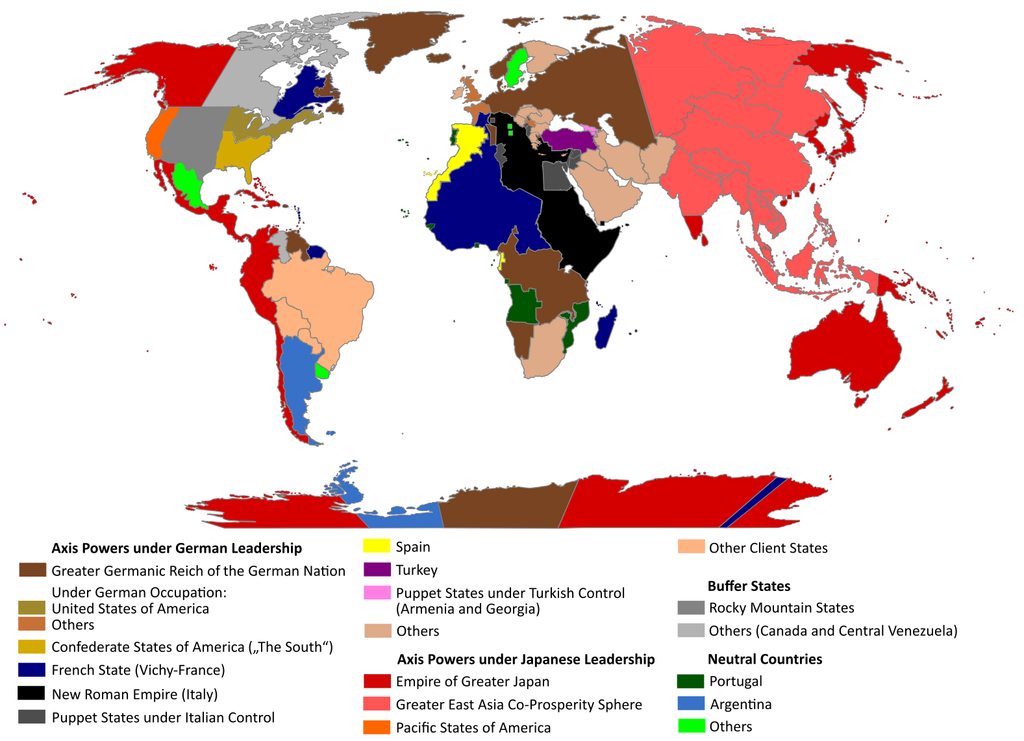In World War II, however, there was a very real possibility that defeat at the hands of our enemies would end our very way of life. Although we weren’t really fully aware of what was happening in Europe under the Nazis, and for that matter what the Japanese were doing to the Chinese and other peoples in lands they’d conquered, everybody knew that to lose to them would be catastrophic. Imagine, for example, a simple alternate-history scenario in which the Japanese hold off on their Pearl Harbor attack, and it’s late 1942 or early ’43 before the U.S. decides things have gone far enough overseas and gets into the war, as we had done back in 1917, well after hostilities had begun in World War I. That extra year or so might very well have given the Germans time to accomplish their strategic goals of knocking out the Russians in the east and forcing the British to surrender in the west. With all of Europe secured, not to mention North Africa and the Middle East, with its vast oil reserves, and with his cities and factories virtually immune to enemy air attack, Hitler would have had time to let his scientists and engineers complete development of their advanced weapons and delivery systems: jet aircraft, long-range bombers, intercontinental missiles, and most importantly, the atomic bomb. With those weapons, Germany could have dictated terms to the surviving democracies in the Western Hemisphere. This is a theme explored often in fiction, both in books and in movies and TV series like The Man in the High Castle.