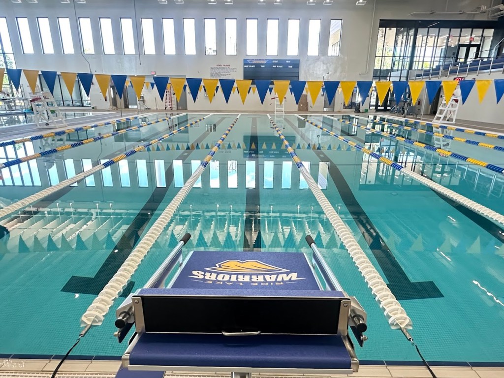 I have a tradition that I started a few years ago: do a lap underwater to close my workout. In the old pool, which was shallow at one end to allow for wading, aerobics classes and for children’s play, I would go to one corner of the shallow end and swim underwater–usually successfully–to the opposite corner of the deep end, under the lane ropes and through the diving area to the ladder, a distance of about 35 meters. That’s not possible with the new pool, which actually has two pools: one for lane swimming only, pictured above, and an adjacent pool that is shallow at one end and deep at the other, to accommodate diving. Moreover, the new pool is measured in yards, not meters; the local high school swim team practices and competes here, and the state association uses Imperial measurements, not metric, as in the Olympics. (The NCAA is still using Imperial measure, but is considering switching to meters.)