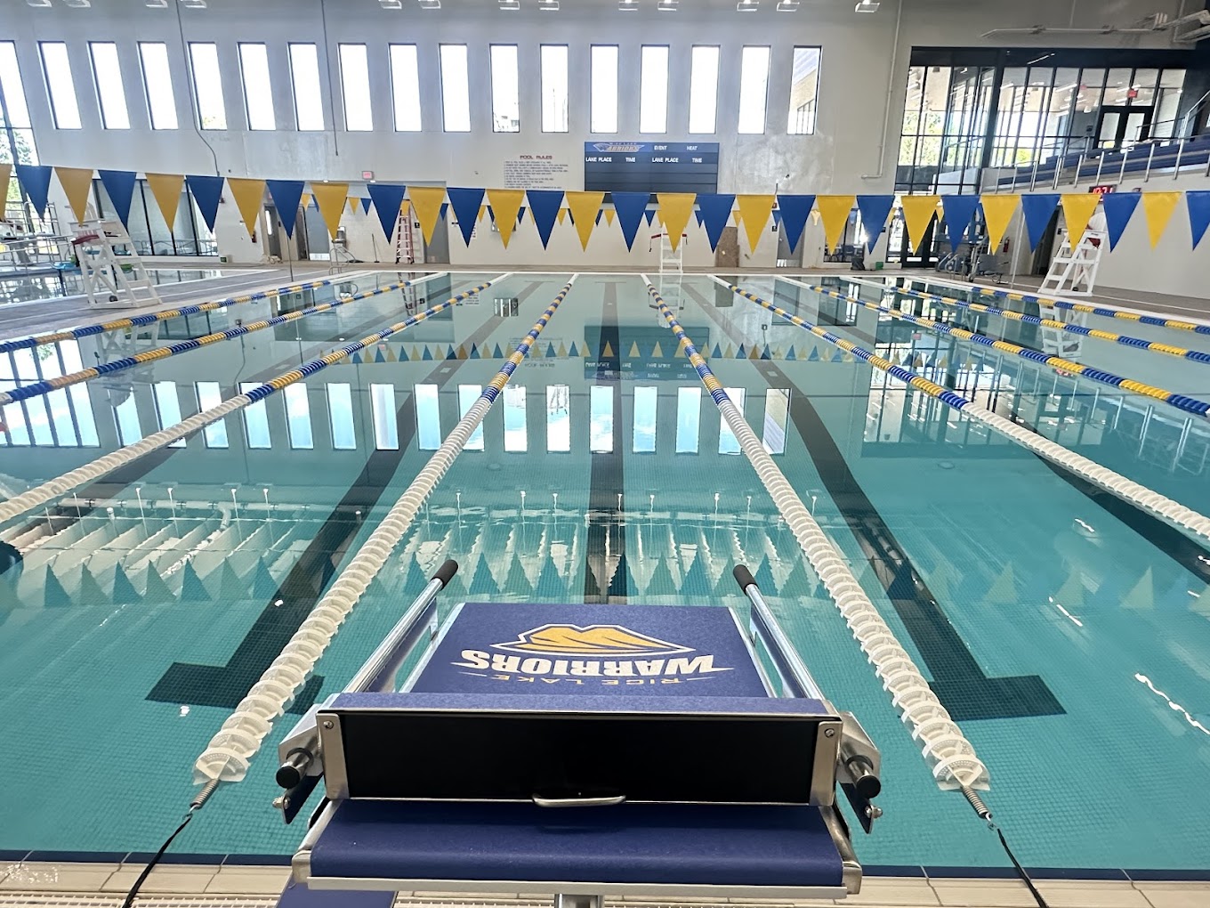 I have a tradition that I started a few years ago: do a lap underwater to close my workout. In the old pool, which was shallow at one end to allow for wading, aerobics classes and for children’s play, I would go to one corner of the shallow end and swim underwater–usually successfully–to the opposite corner of the deep end, under the lane ropes and through the diving area to the ladder, a distance of about 35 meters. That’s not possible with the new pool, which actually has two pools: one for lane swimming only, pictured above, and an adjacent pool that is shallow at one end and deep at the other, to accommodate diving. Moreover, the new pool is measured in yards, not meters; the local high school swim team practices and competes here, and the state association uses Imperial measurements, not metric, as in the Olympics. (The NCAA is still using Imperial measure, but is considering switching to meters.)